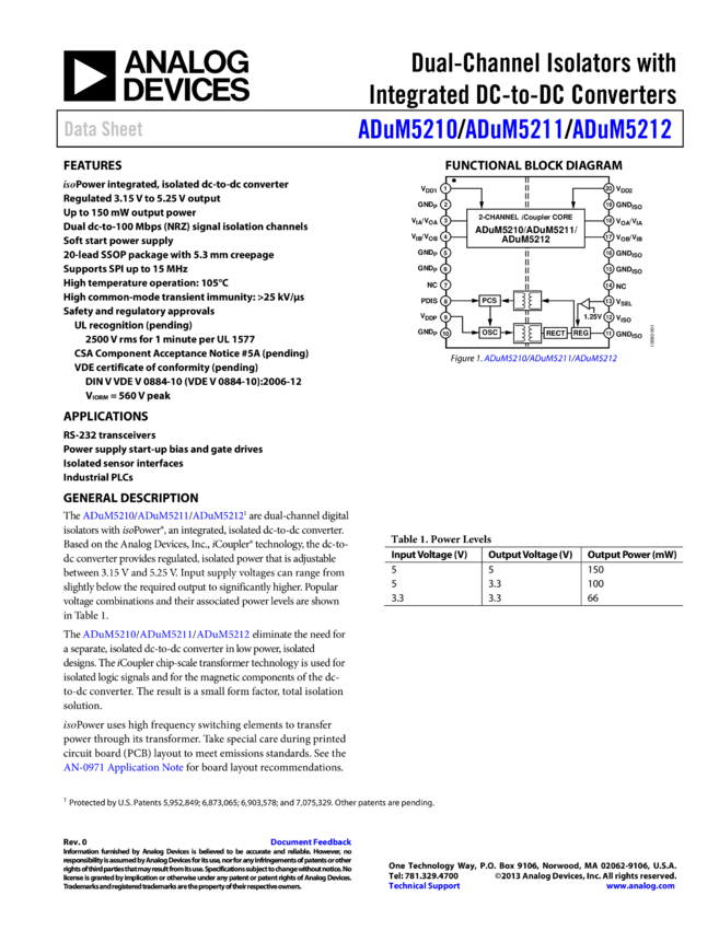 ADUM5211: Dual-Channel Isolators with Integrated DC/DC Converter (1/1 Channel Directionality)