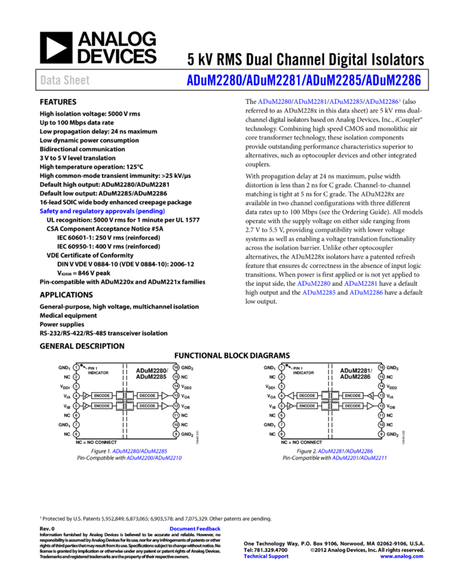 ADUM2286: 5 V RMS Dual Channel Digital Isolators (Default Low, 1/1 Channel Directionality)