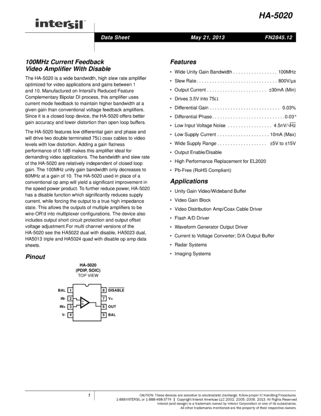 100MHz Current Feedback Video Amplifier With Disable
