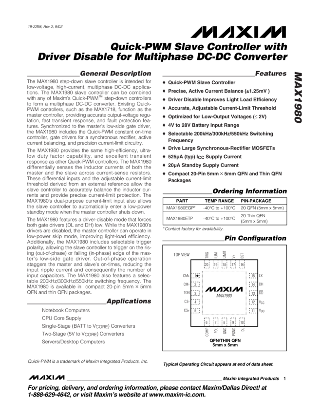 MAX1980 Quick-PWM Slave Controller with Driver Disable for Multiphase, DC-DC Converter