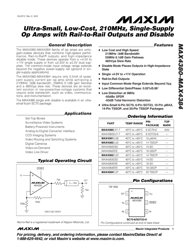 MAX4380, MAX4381, MAX4382, MAX4383, MAX4384 Ultra-Small, Low-Cost, 210MHz, Single-Supply Op Amps with Rail-to-Rail Outputs and Disable