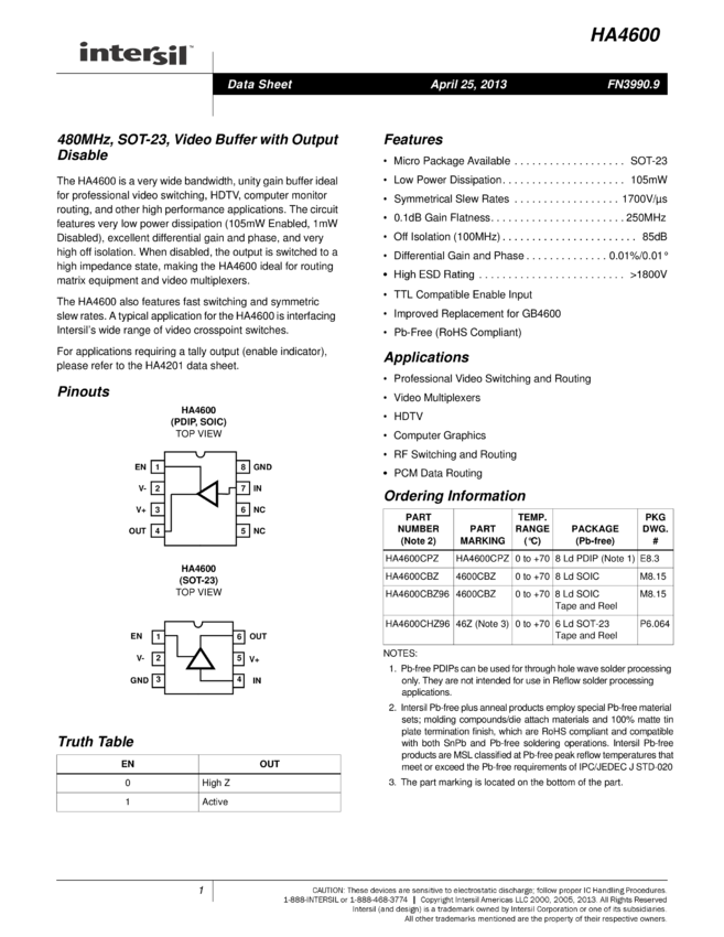 480MHz, SOT-23, Video Buffer with Output Disable