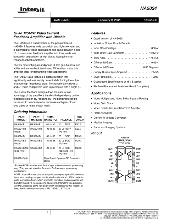 Rad-Hard, High Speed, Low Power, Current Feedback Op Amp with Output Disable