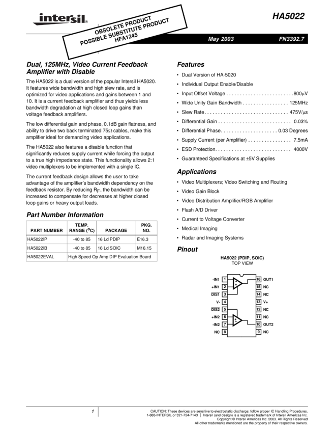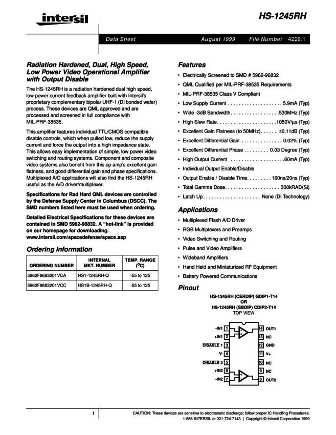 Rad-Hard, Dual, High Speed, Low Power Video Operational Amplifier with Output Disable