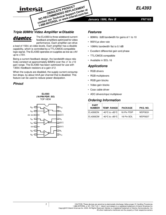 250MHz Triple Current Feedback Amp with Disable