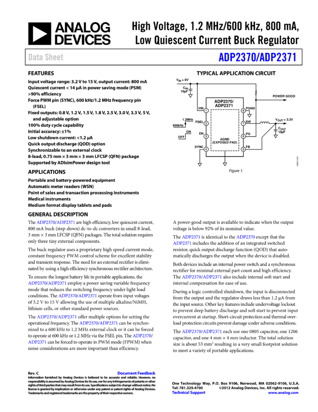 ADP2371: High Voltage, 1.2 MHz/600 kHz, 800 mA, Low Quiescent Current Buck Regulator with Quick Output Discharge Function