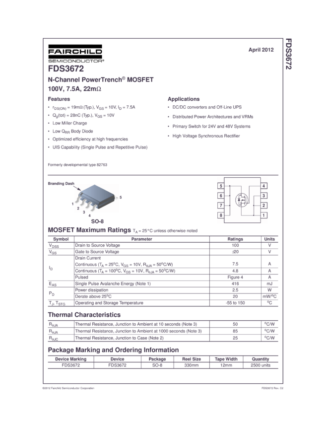 Discrete Commercial N-Channel UltraFET Trench MOSFET, 100V, 7.5A, 0.022 Ohm @ Vgs = 10V, SO-8 Package