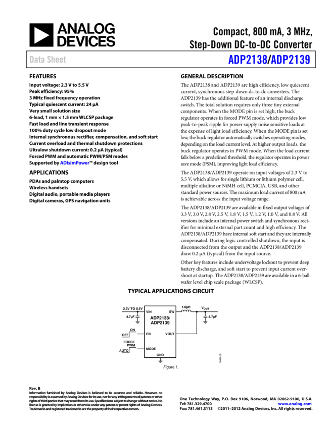 ADP2139: Compact, 800 mA, 3 MHz, Step-Down DC-to-DC Converter with an Internal Discharge Switch