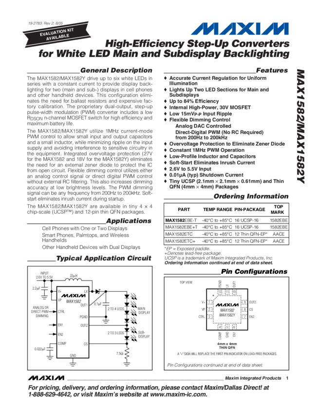 MAX1582 High Efficiency 26V Step-Up Converter for White LED Main and Sub Displays