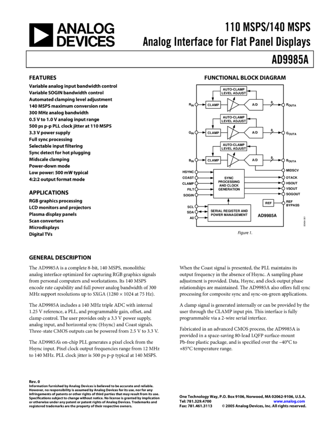 AD9985A: 110 MSPS/140 MSPS Analog Interface for Flat Panel Displays
