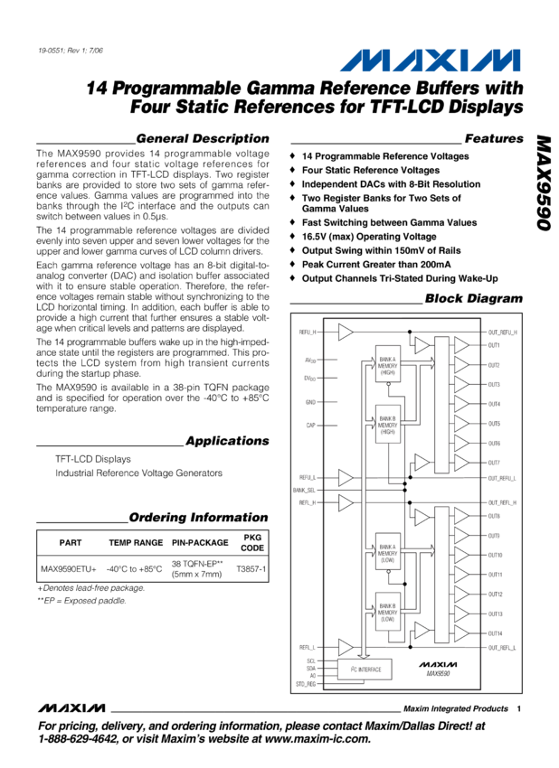MAX9590 14 Programmable Gamma Reference Buffers with 4 Static References for TFT-LCD Displays