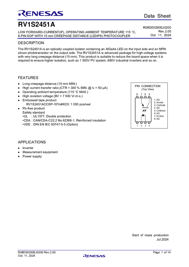 Low Forward-Current (IF), Operating Ambient Temperature 115 °C, 8-Pin SOP with 15 mm Creepage Distance (LSDIP8) Photocoupler