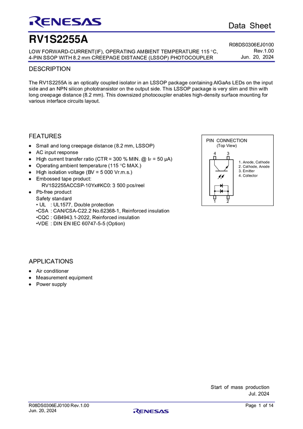 Low Forward-Current (IF), Operating Ambient Temperature 115 °C, 4-Pin SSOP with 8.2mm Creepage Distance (LSSOP) Photocoupler