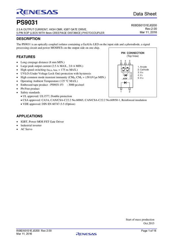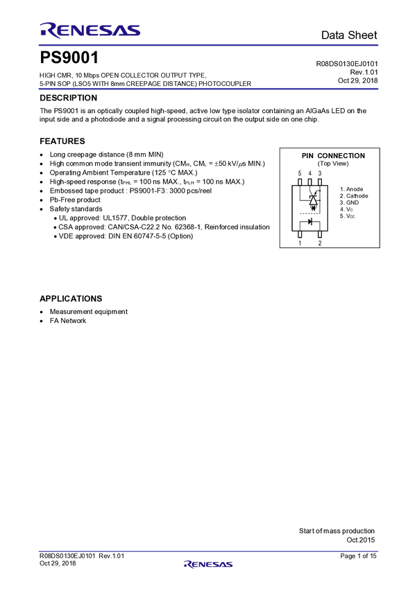 High CMR, 15Mbps CMOS Output, Low Forward Current (IF) 3.3V/5V Operation, 5-PIN with 8mm Creepage Distance Package LSO5 Photocoupler