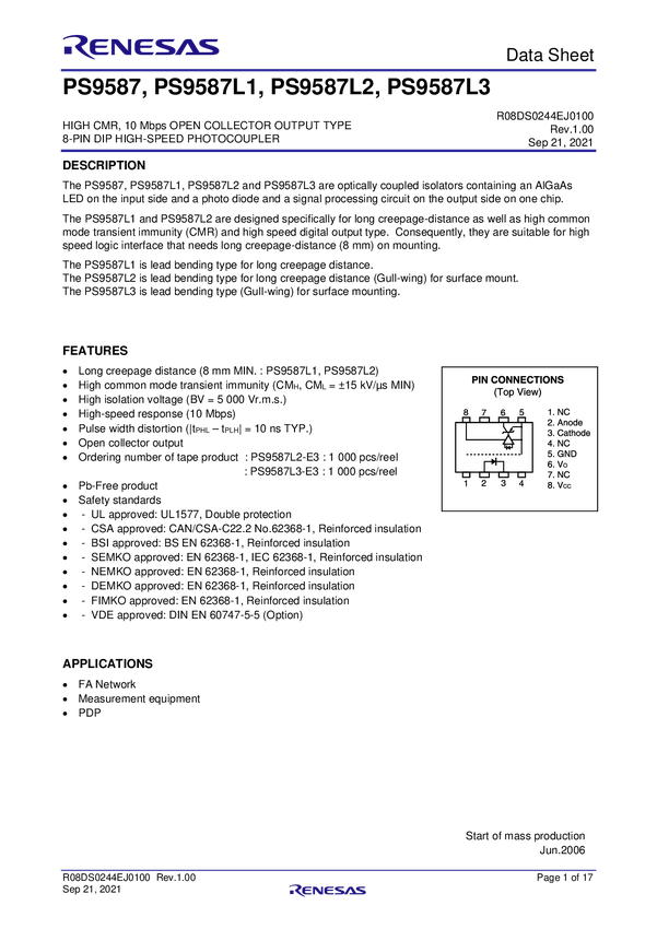 HIGH CMR, 10 Mbps OPEN COLLECTOR OUTPUT TYPE, 8-PIN LSDIP PHOTOCOUPLER FOR CREEPAGE DISTANCE OF 15 mm