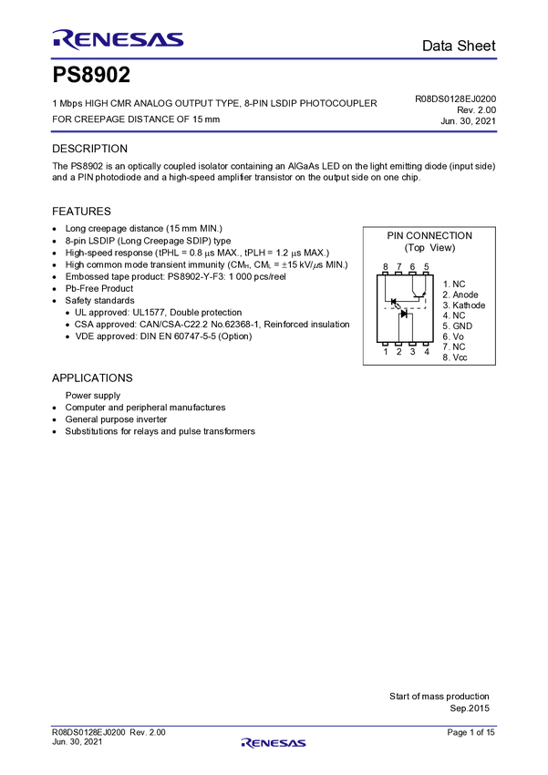 1 Mbps HIGH CMR ANALOG OUTPUT TYPE, 8-PIN LSDIP PHOTOCOUPLER FOR CREEPAGE DISTANCE OF 15 mm