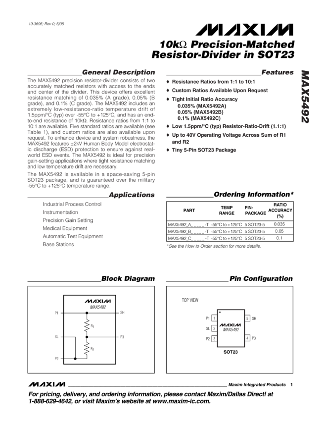 MAX5492 10kΩ Precision-Matched Resistor-Divider in SOT23