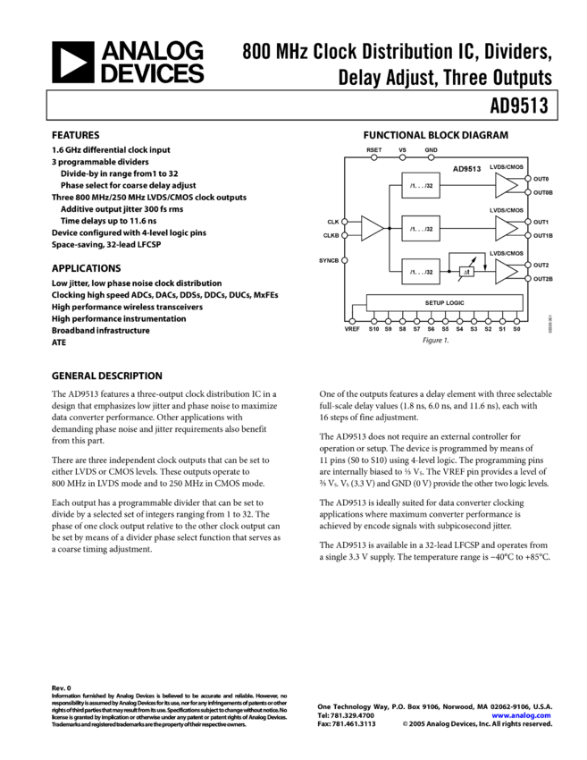 AD9513: 800 MHz Clock Distribution IC,Dividers, Delay Adjust, Three Outputs