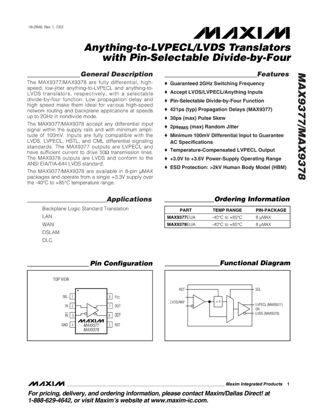 MAX9377, MAX9378 Anything-to-LVPECL/LVDS Translators with Pin-Selectable Divide-by-Four