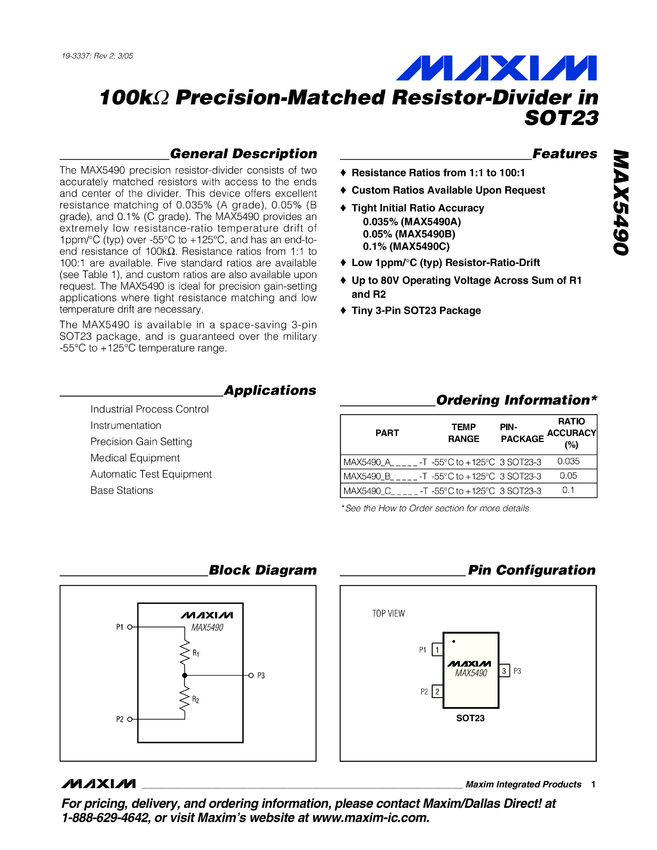 MAX5490 100kΩ Precision-Matched Resistor-Divider in SOT23