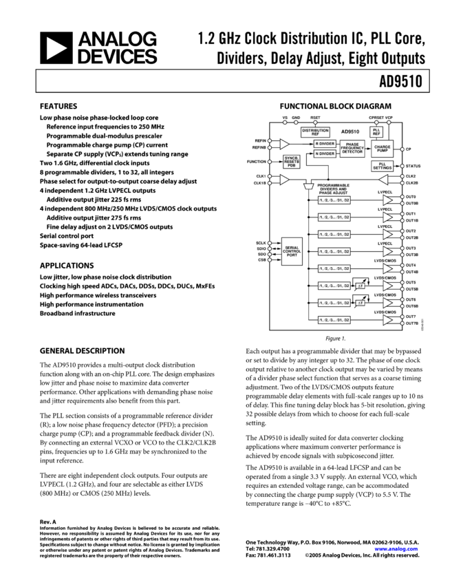 AD9510: 1.2 GHz Clock Distribution IC, PLL Core, Dividers, Delay Adjust, Eight Outputs