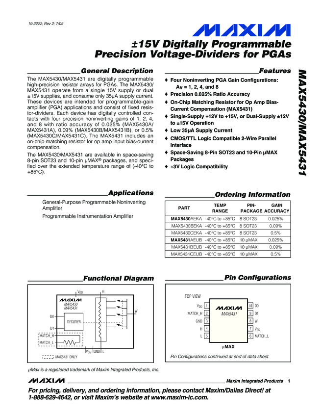 MAX5430, MAX5431 ±15V Digitally Programmable Precision Voltage-Dividers for PGAs