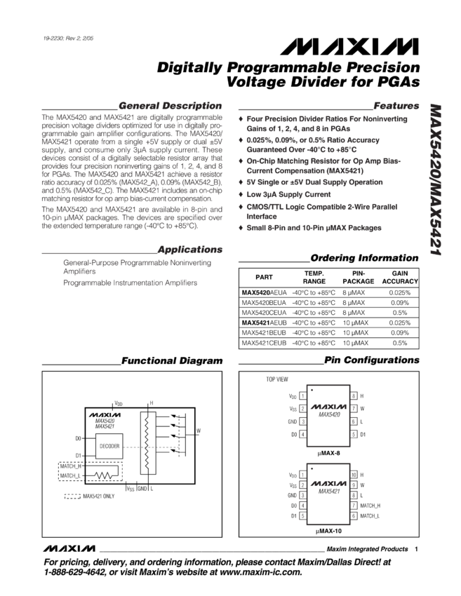 MAX5420, MAX5421 Digitally Programmable Precision Voltage Divider for PGAs
