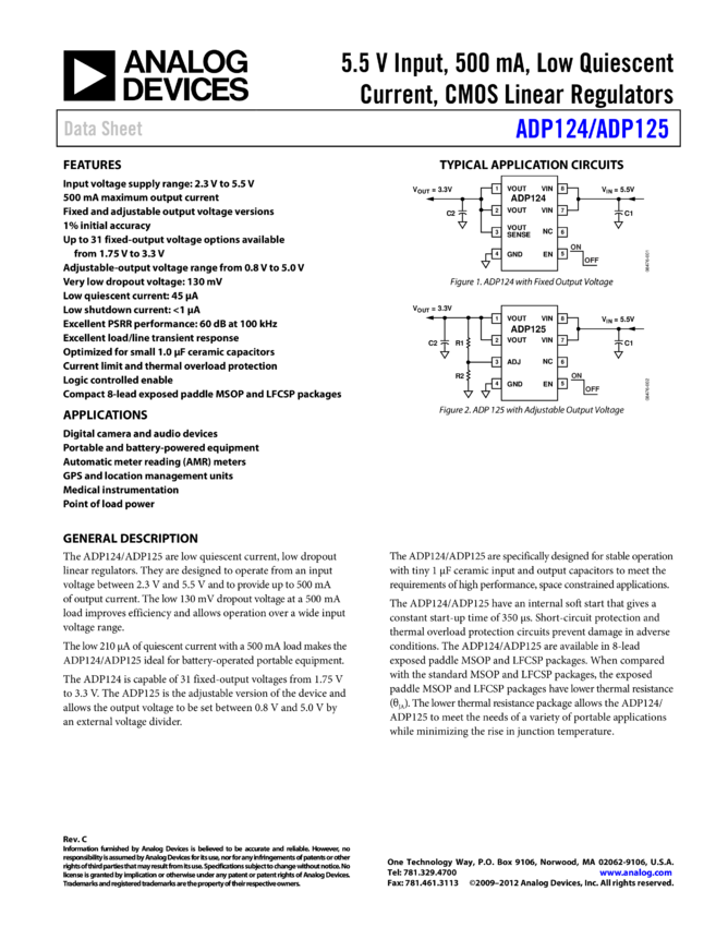 ADP125: 5.5V Input, 500 mA, Low Quiescent Current, CMOS Linear Regulator w/External Voltage Divider