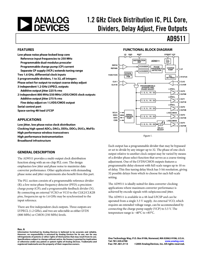 AD9511: 1.2 GHz Clock Distribution IC, PLL Core, Dividers, Delay Adjust, Five Outputs