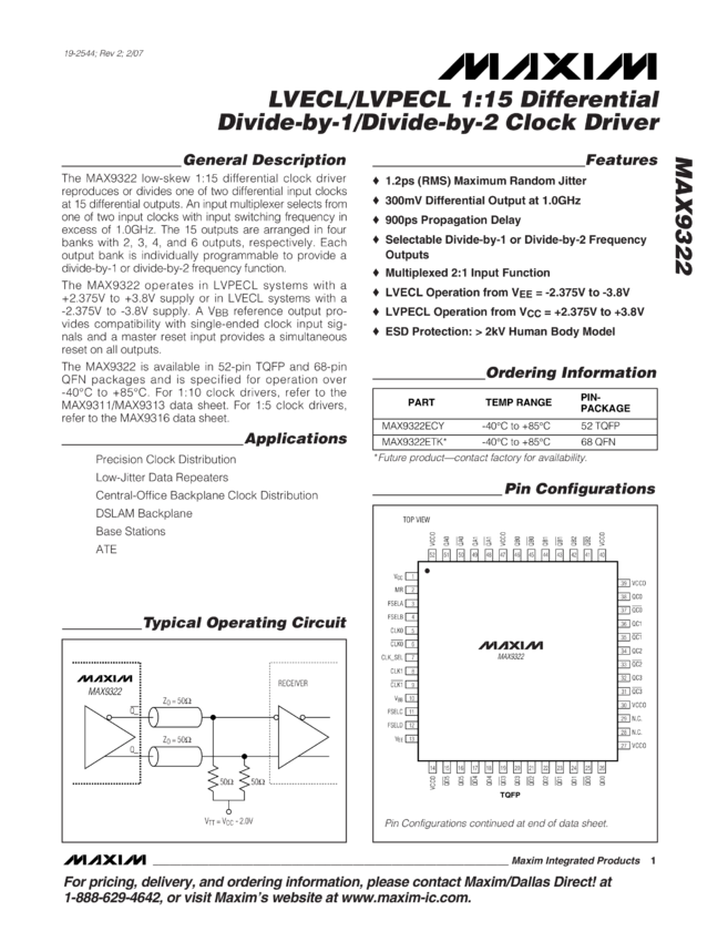 MAX9322 LVECL/LVPECL 1:15 Differential Divide-by-1/Divide-by-2 Clock Driver