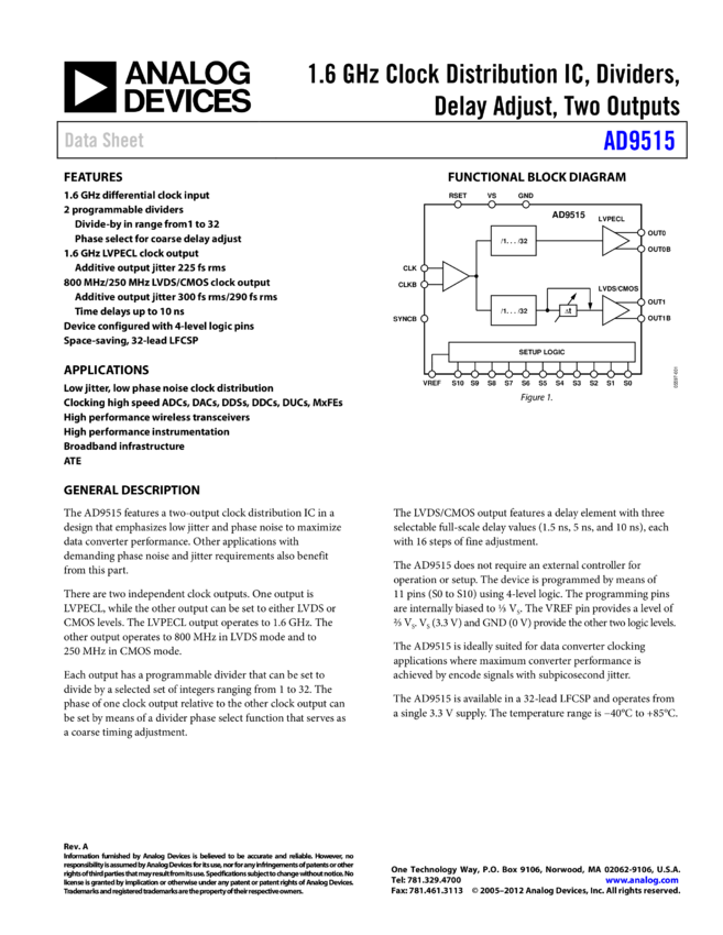 AD9515: 1.6 GHz Clock Distribution IC, Dividers, Delay Adjust, Two Outputs
