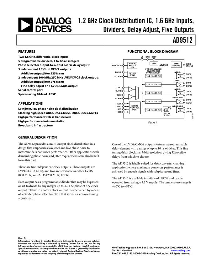 AD9512: 1.2 GH Clock Distribution IC, Two 1.6 GH Inputs, Dividers, Delay Adjust, Five Outputs