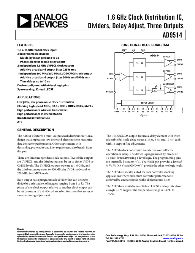 AD9514: 1.6 GHz Clock Distribution IC, Dividers, Delay Adjust, Three Outputs