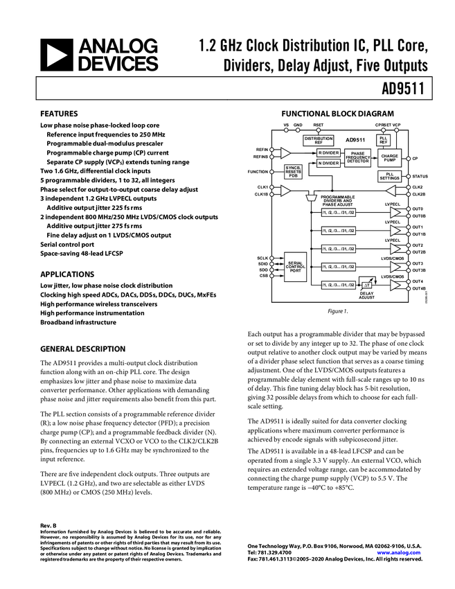 AD9511: 1.2 GHz Clock Distribution IC, PLL Core, Dividers, Delay Adjust, Five Outputs