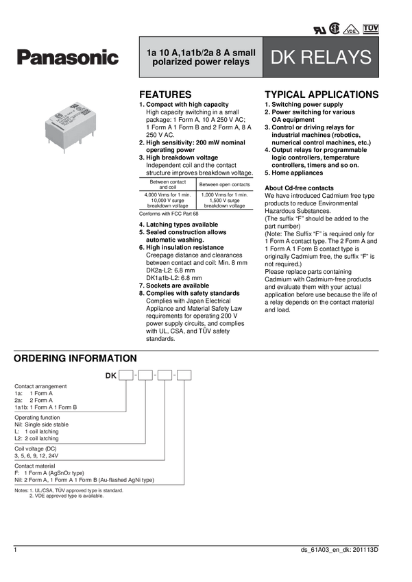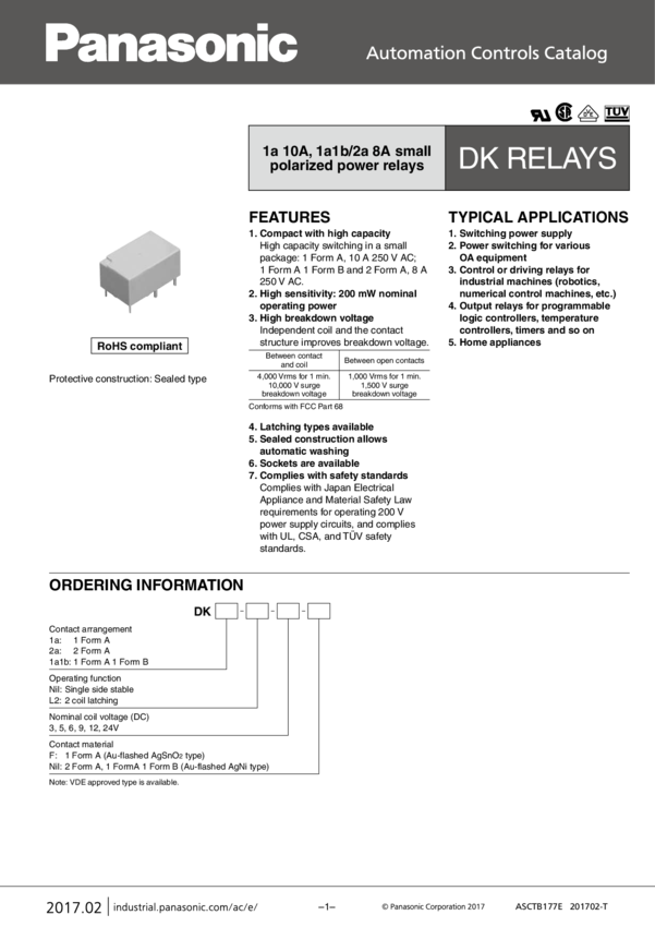 Panasonic DK1A1B-24V Przekaźnik SMT DK1A1B-24V, monostabilny, 1 cewka, 125 V/DC, 250 V/AC, 8 A, 1 szt.