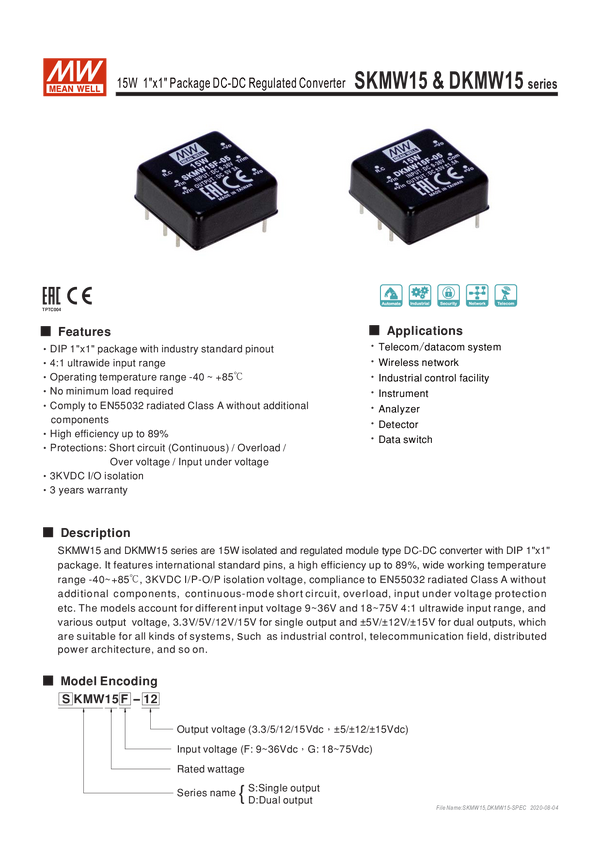 MW Mean Well DKMW15F-05 Przetwornica DC/DC, 15 W, 5 V, 1.5 A, 1 szt.