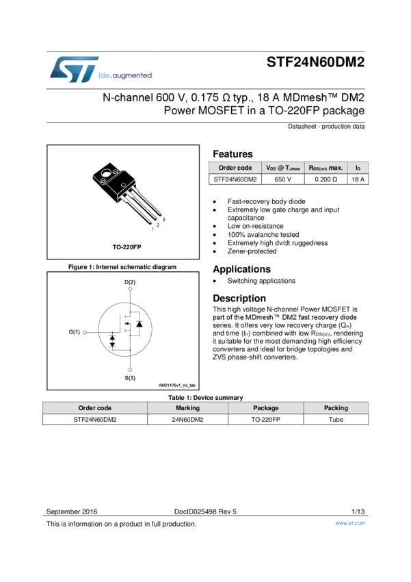 N-channel 600 V, 0.094 Ohm typ., 28 A MDmesh DM2 Power MOSFETs in TO-220 package