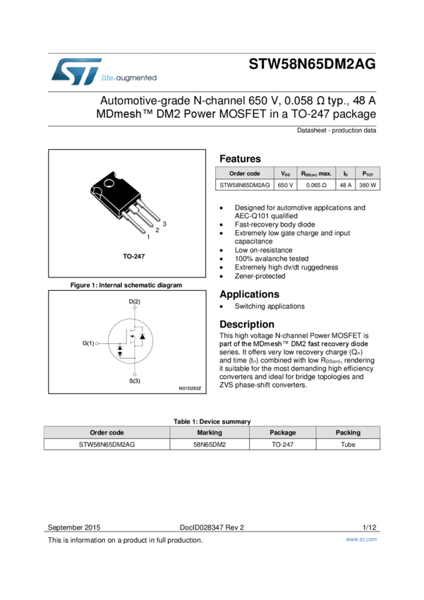 Automotive-grade N-channel 650 V, 0.058 Ohm typ., 48 A MDmesh DM2 Power MOSFET in a TO-247 package