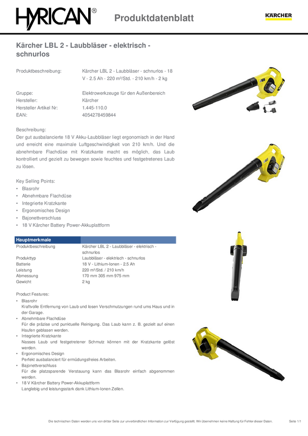 Kärcher Home & Garden LBL 2 Battery akumulatorowy 1.445-110.0 Dmuchawa do liści zaw. akumulator 18 V