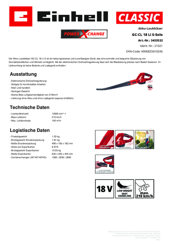 Einhell GC-CL 18 Li E akumulatorowy 1462476+1668363 Dmuchawa do liści zaw. akumulator, zaw. ładowarkę 18 V