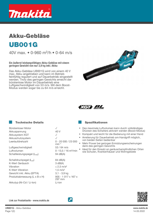 Makita UB001GZ akumulatorowy UB001GZ Dmuchawa do liści bez akumulatora, Bez ładowarki 40 V