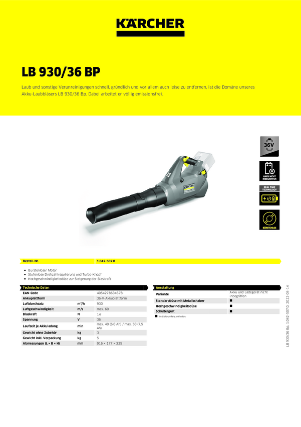 Kärcher Professional LB 930/36 Bp akumulatorowy 1.042-507.0 Dmuchawa do liści bez akumulatora, Bez ładowarki 36 V