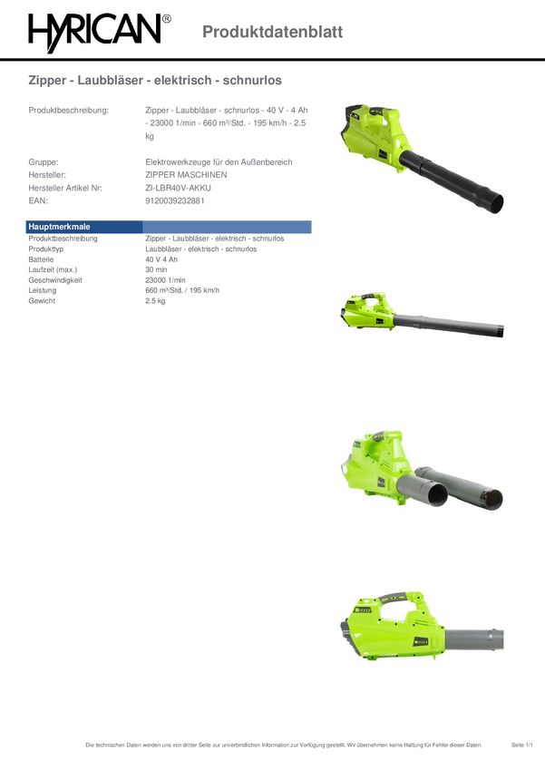 Zipper ZI-LBR40V-AKKU akumulatorowy ZI-LBR40V-AKKU Dmuchawa do liści bez akumulatora 40 V