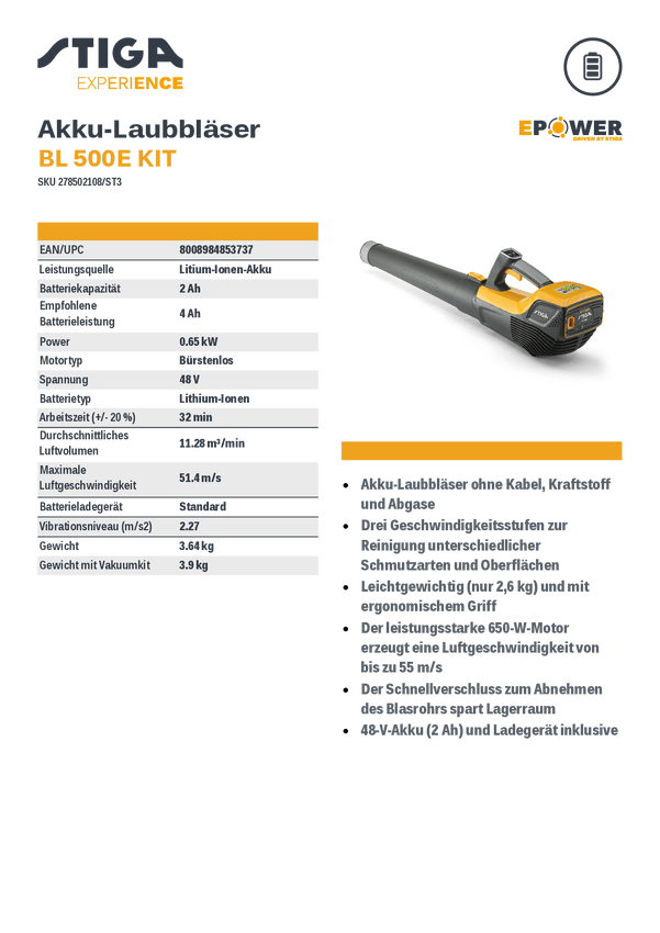 STIGA akumulatorowy BL 500e Dmuchawa do liści zaw. akumulator, zaw. ładowarkę 48 V