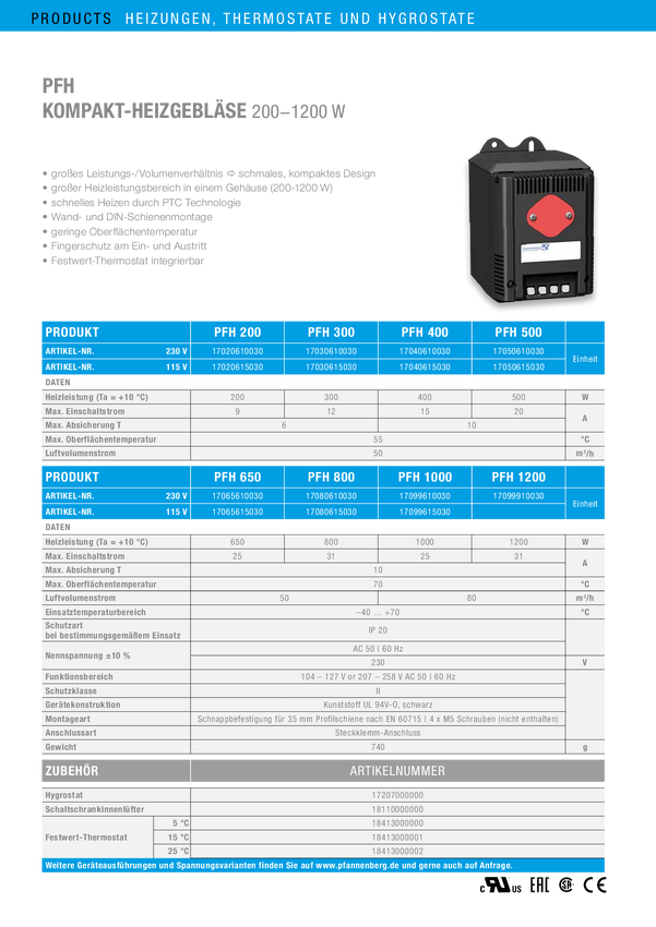 Dmuchawa grzewcza do szafy rozdzielczej Pfannenberg PFH 1000 230V 230 V/AC (max) 1000 W (D x S x W) 126 x 88 x 142 mm