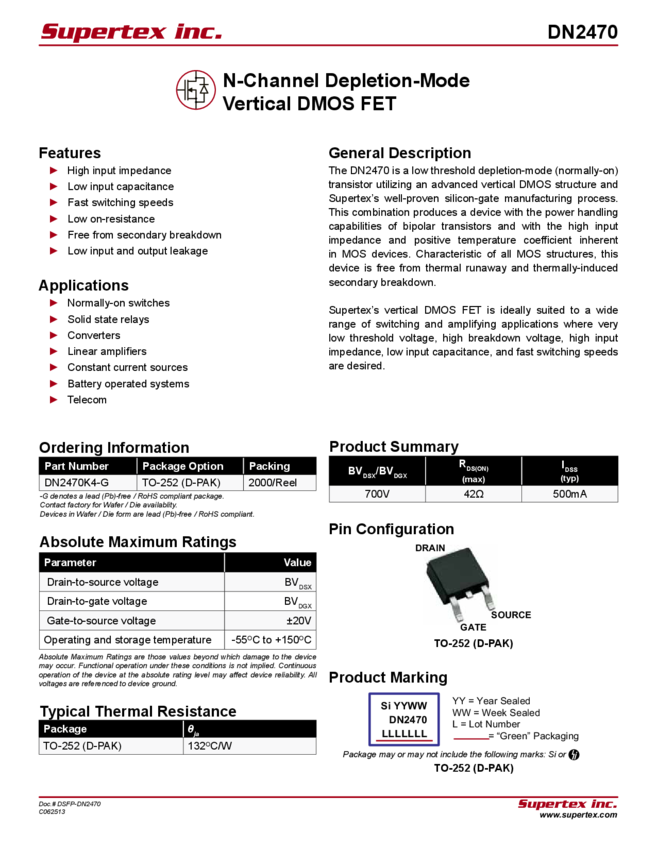 DN2470 Datasheet - N-Channel Depletion-Mode Vertical DMOS FET (06/27/2014)