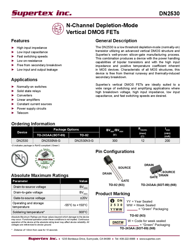 DN2530 Datasheet - N-Channel Depletion-Mode Vertical DMOS FET