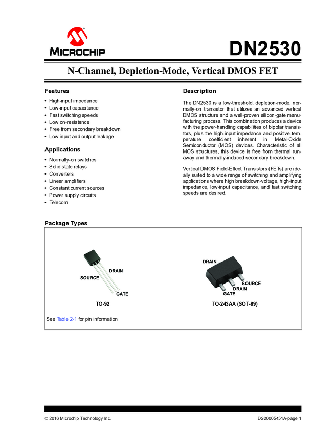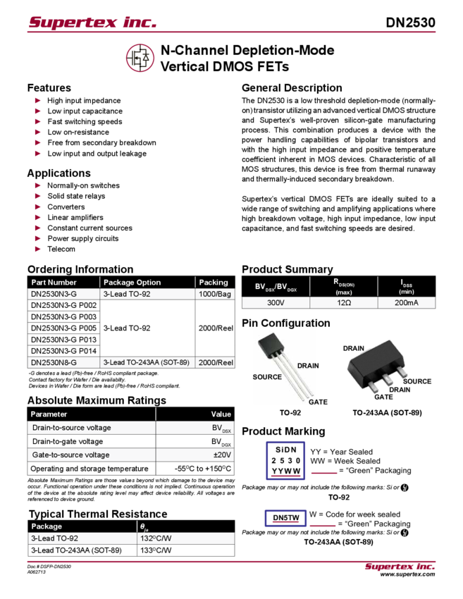 DN2530 Datasheet - N-Channel Depletion-Mode Vertical DMOS FET (06/27/2014)