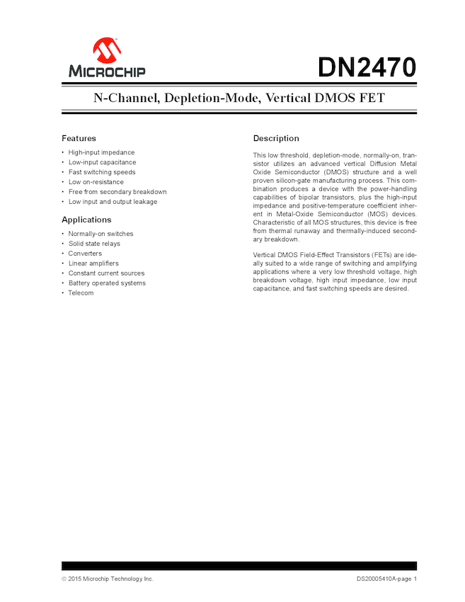 DN2470 Datasheet - N-Channel, Depletion-Mode, Vertical DMOS FET (10/07/2015)