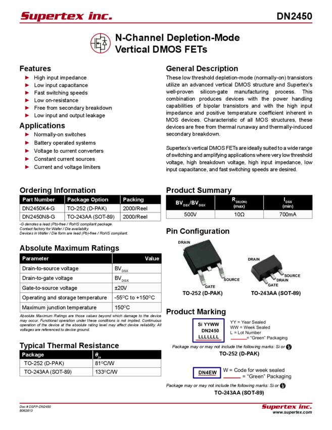 DN2450 Datasheet - N-Channel Depletion-Mode Vertical DMOS FET (06/27/2014)